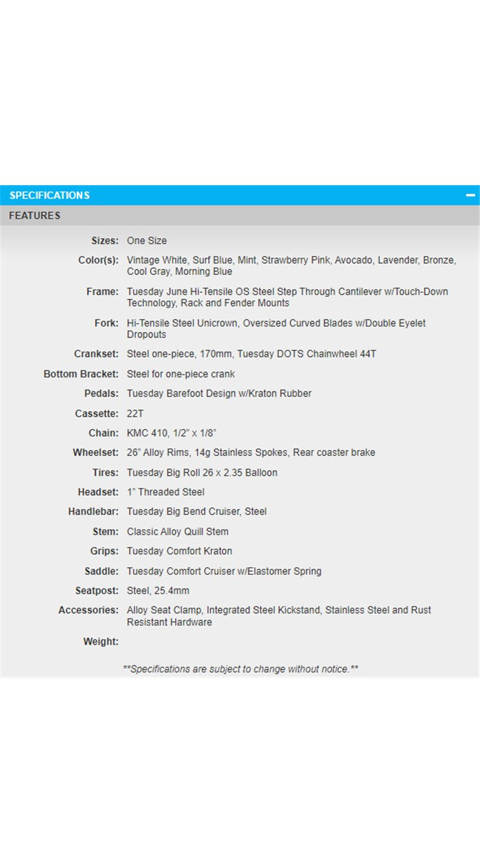 Handlebars: Extra-wide Tuesday Cruiser Bars keep you sitting upright with arms stretched out comfortably. It’s all about slow rollin’, taking in those seaside views and salty ocean air.
